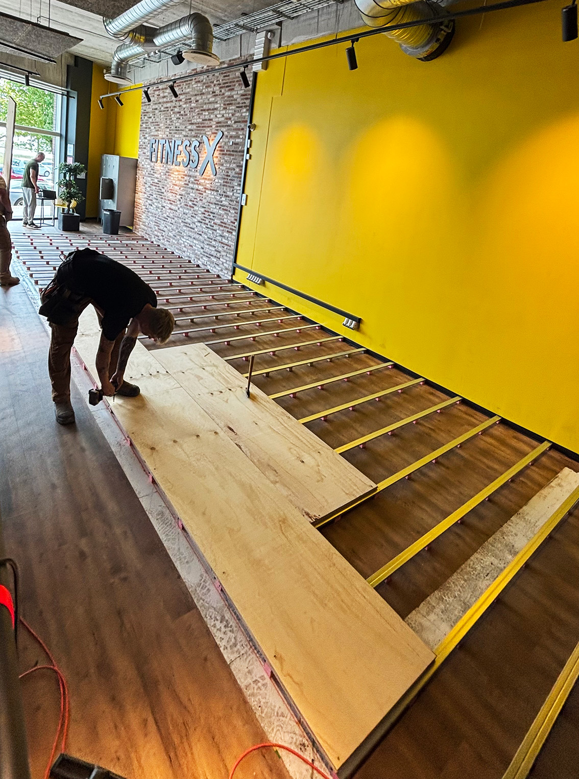 On top of the VT-BAT system, the gym floor was designed and installed with two layers of plywood and a mass concrete layer, topped with the client’s standard wooden flooring.