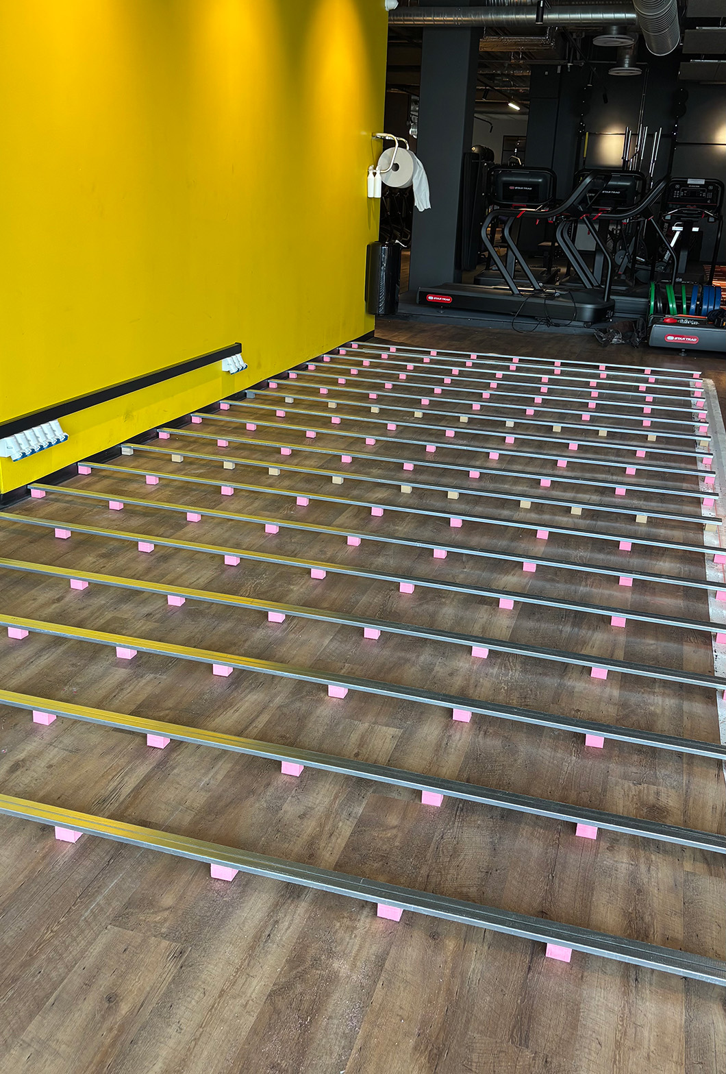 To eliminate the problem, Vibratec proposed our well-tested and documented floor system VT-BAT — a floating floor solution that has been successfully used in many gym applications where a high insertion loss of structure-borne noise is required.
